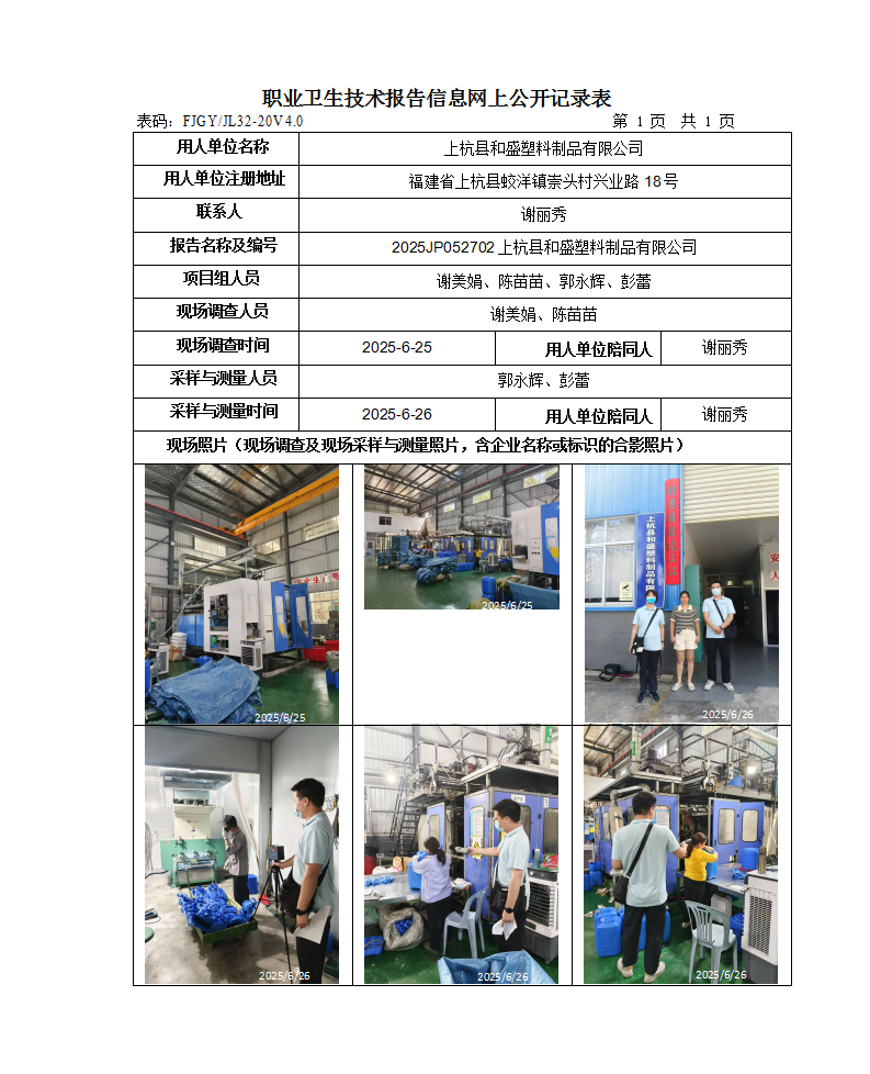 上杭縣和盛塑料制品有限公司-2025年工作場(chǎng)所職業(yè)病危害因素檢測(cè)