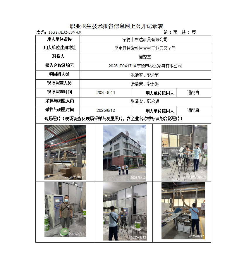 寧德市杉達(dá)家具有限公司-2025年工作場所職業(yè)病危害因素檢測