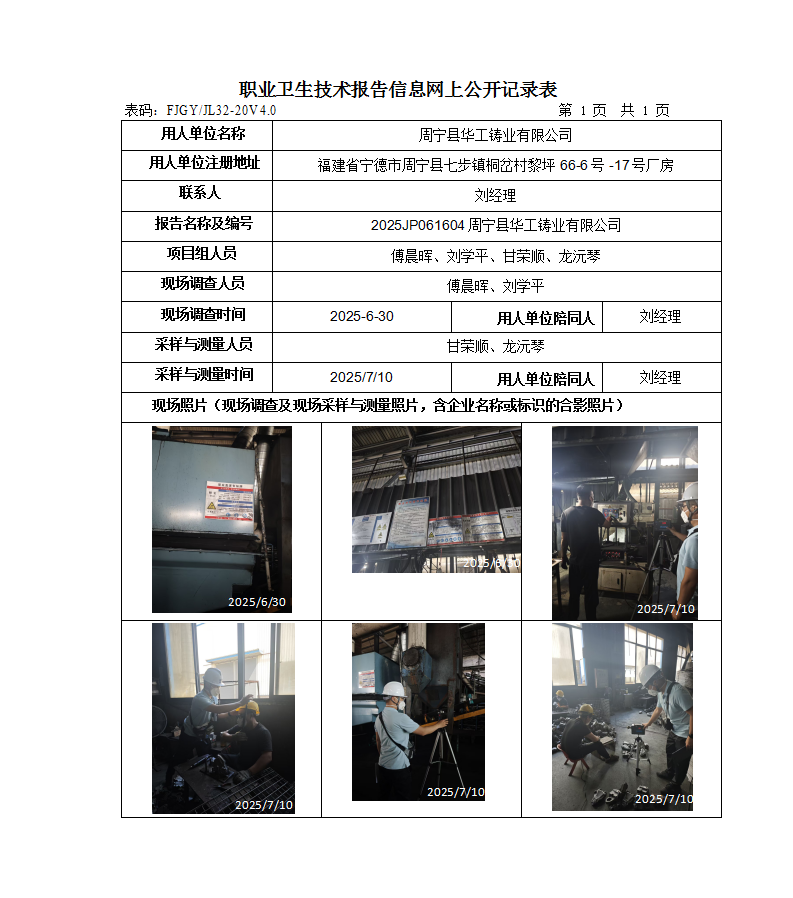 周寧縣華工鑄業(yè)有限公司-2025年工作場所職業(yè)病危害因素檢測