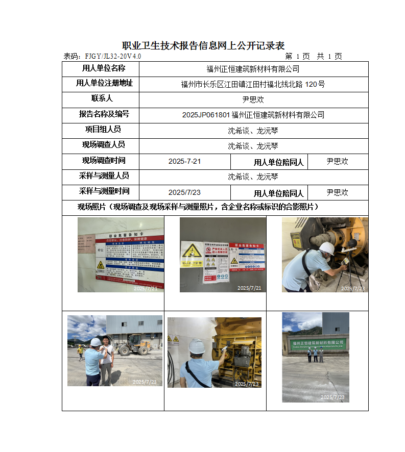 福州正恒建筑新材料有限公司-2025年工作場所職業(yè)病危害因素檢測